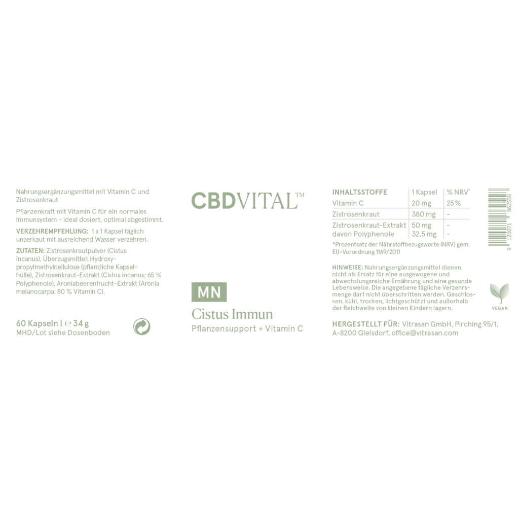 Zutaten: Zistrosenkrautpulver (Cistus incanus) 66,1%, Überzugsmittel: Hydroxypropylmethylcellulose (pflanzliche Kapselhülle), Zistrosenkraut-Extrakt (Cistus incanus; 65% Polyphenole) 8,7%, Aroniabeerenfrucht- Extrakt (Aronia melanocarpa; 80% Vitamin C)