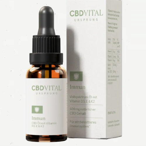 Volle Vitamin-Power für das Immunsystem: CBDVITAL Ursprung IMMUN ist ein speziell abgestimmter Komplex für Ihre Abwehrkräfte. Die Formel kombiniert die fettlöslichen Vitamine D3, E und K2 mit den Vorteilen von CBÖl. Der natürliche Pflanzenstoff ist aufgrund seines vielseitigen Potenzials und der entspannenden und ausgleichenden Eigenschaften beliebt. Die fettlöslichen Vitamine D3, E und K2 sind für viele körperlichen Funktionen essenziell. Vitamin D trägt zu einer normalen Funktion des Immunsystems sowie zur Erhaltung normaler Knochen bei. Vitamin E wird als oxidativer Schutz für die Zellen eingesetzt.